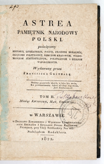 ASTREA. Pamiętnik narodowy polski, poświęcony historyi, literaturze, poezyi, filozofii moralney [...].