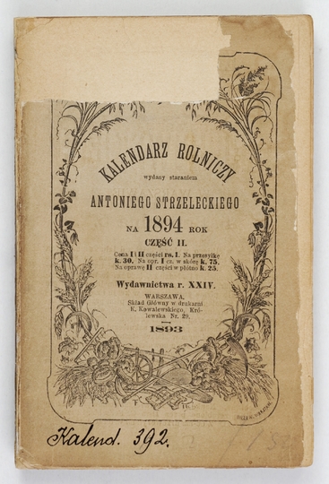 KALENDARZ Rolniczy wydany staraniem Antoniego Strzeleckiego na 1894 rok. Cz. 2. Wydawnictwa r. XXIV. Warszawa 1893. Skł gł. w druk. K. Kowalewskiego. 16d, s. X, [4], 367, [1], 32. brosz.