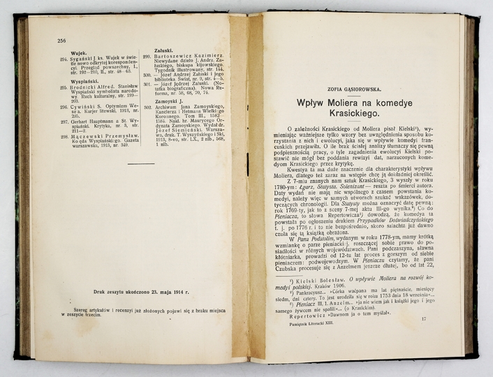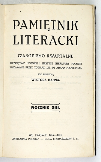 PAMIĘTNIK Literacki. Czasopismo kwartalne poświęcone historyi i krytyce literatury polskiej wydawane przez Towarz. Lit. im. Adama Mickiewicza. Pod red. Wiktora Hahna. R. XIII. Lwów 1914-15. Drukarnia Polska. 8, s. VIII, [2], 444, [1]. opr. ppł. z epoki.