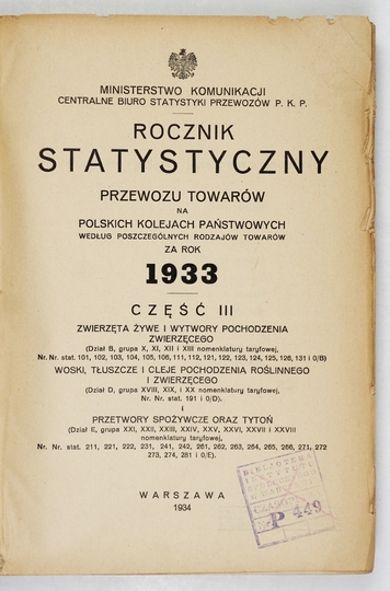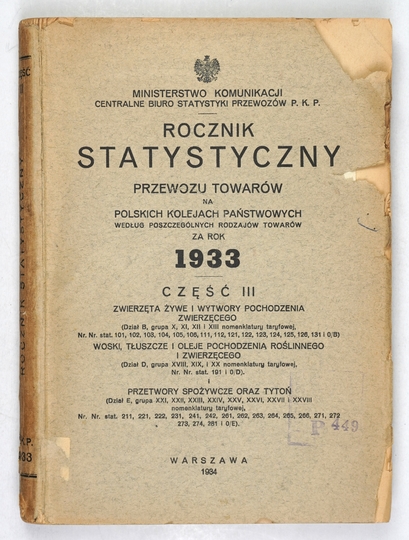 ROCZNIK statystyczny przewozu towarów na Polskich Kolejach Państwowych za rok 1933. Cz. 3: Zwierzęta żywe i wytwory pochodzenia zwierzęcego [...] Woski, tłuszcze i oleje pochodzenia roślinnego i zwierzęcego [...] Przetwory spożywcze oraz tytoń [...]. Warszawa 1934. Ministerstwo Komunikacji, Centralne Biuro Statystyki Przewozów P. K.P. 8, s. VIII, 407. brosz.