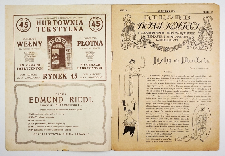 ŚWIAT Kobiecy Record. Czasopismo poświęcone modzie i sprawom kobiecym. Lwów. B. Połoniecki. Red. A. W. Bednarski. 4. brosz.