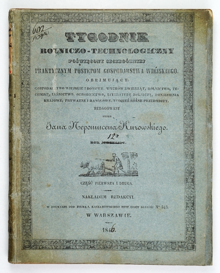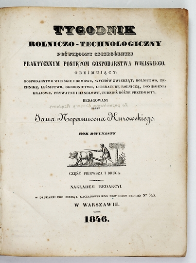 TYGODNIK Rolniczo-Technologiczny poświęcony szczególniej praktycznym postępom gospodarstwa wiejskiego. Obejmujący gospodarstwo wiejskie i domowe, wychów zwierząt, rolnictwo, technikę, leśnictwo, ogrodnictwo, literaturę rolniczą, doniesienia krajowe, prywatne i handlowe, tudzież różne przedmioty. Warszawa. Red. Jan Nepomucen Kurowski. 8, opr. kart. z epoki, okł. brosz. naklejona na oprawę.