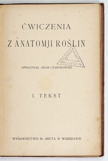 CZARTKOWSKI Adam – Ćwiczenia z anatomji roślin. [Cz.] 1-2. Oprac. ... Warszawa 1912. Wydawnictwo M. Arcta. 16d, s. 108, [4]; [4], 31. opr. oryg. ppł.