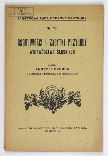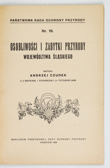 CZUDEK Andrzej – Osobliwości i zabytki przyrody województwa śląskiego. Z 4 mapkami, 1 rysunkiem i 21 fotografjami. Kraków 1929. Państw. Rada Ochrony Przyrody. 8, s. [4], 78, [2], tabl. 8. brosz. Państwowa Rada Ochrony Przyrody, nr 19.