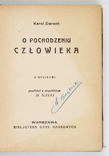 DARWIN Karol – O pochodzeniu człowieka. Z rycinami. Przeł. z angielskiego M. Ilecki. Warszawa [1932]. Bibljoteka Dzieł Wyborowych. 16d, s. 267, [5]. opr. późn. ppł.
