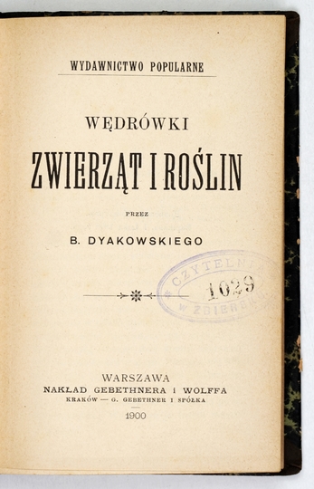 DYAKOWSKI B[ogdan] – Wędrówki zwierząt i roślin. Warszawa 1900. Nakł. Gebethnera i Wolffa. 16d, s. 219. opr. późn. ppł.