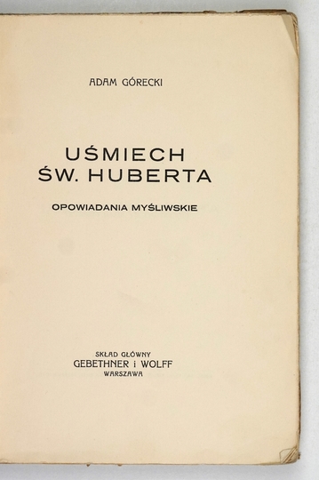 GÓRECKI Adam – Uśmiech św. Huberta. Opowiadania myśliwskie. Warszawa [1938]. Skł. gł. Gebethner i Wolff. 8, s. 182, [3]. brosz.