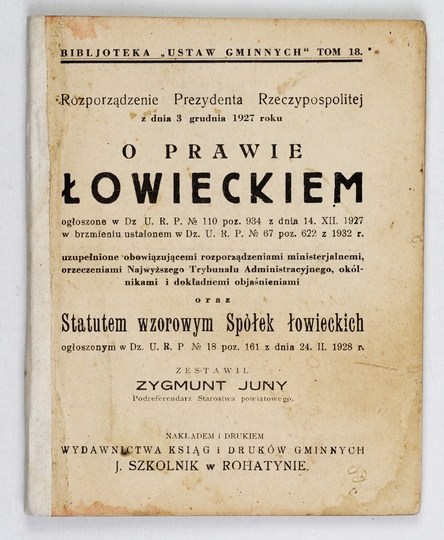 JUNY Zygmunt – Rozporządzenie Prezydenta Rzeczypospolitej z dnia 3 grudnia 1927 roku o prawie łowieckiem [...] uzupełnione obowiązującemi rozporządzeniami ministerjalnemi, orzeczeniami Najwyższego Trybunału Administracyjnego, okólnikami i dokładnemi objaśnieniami oraz Statutem wzorowym Spółek łowieckich [...] z dnia 24 II 1928 r. Zestawił ... Rohatyn [1932]. Nakł. i drukiem Wydawnictwa Ksiąg i Druków Gminnych J. Szkolnik. 16, s. 101, [11]. brosz. Bibljoteka "Ustaw Gminnych", t. 18.