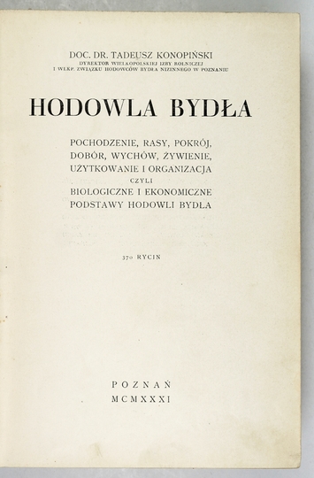 KONOPIŃSKI Tadeusz – Hodowla bydła. Pochodzenie, rasy, pokrój, dobór, wychów, żywienie, użytkowanie i organizacja czyli biologiczne i ekonomiczne podstawy hodowli bydła. 370 rycin. Poznań 1931. Rolnicza Drukarnia i Księgarnia Nakładowa. 8, s. XVI, 975, [1]. opr. oryg. pł.
