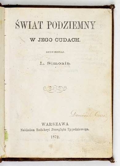 SIMONIN L[ouis-Laurent] – Świat podziemny w jego cudach. Warszawa 1872. Nakł. Redakcyi Przeglądu Tygodniowego. 16d, s. [2], 160. opr. psk. z epoki.