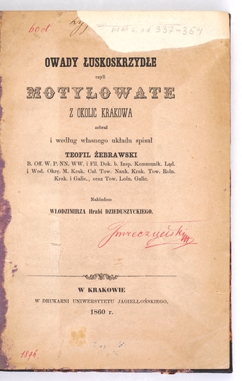 ŻEBRAWSKI Teofil – Owady łuskoskrzydłe czyli motylowate z okolic Krakowa. Zebrał i według własnego układu spisał ... Kraków 1860. W. Dzieduszycki. 8, s. XIII, [1], 336, tabl. 12. opr. późn. ppł.