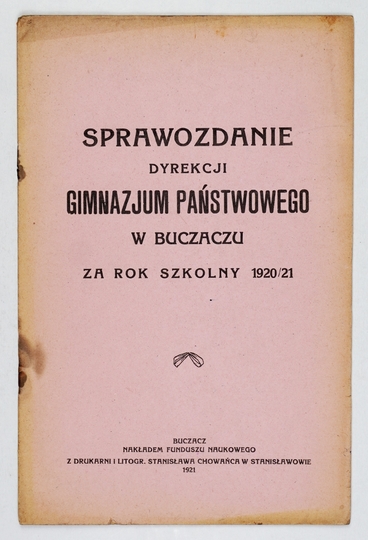 [BUCZACZ, Gimnazjum Państwowe]. Sprawozdanie Dyrekcji ... za rok szkolny 1920/21. Buczacz 1921. Nakł. Funduszu Nauk. 8, s. 16. brosz.