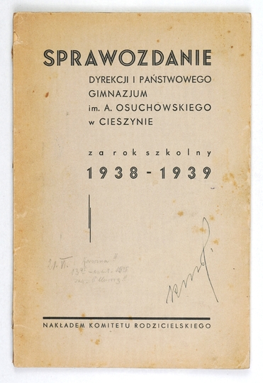 [CIESZYN, I Państwowe Gimnazjum im. A. Osuchowskiego]. Sprawozdanie Dyrekcji ... za rok szkolny 1938-1939. Cieszyn [1939]. Nakł. Komitetu Rodzicielskiego. 8, s. 124. brosz.