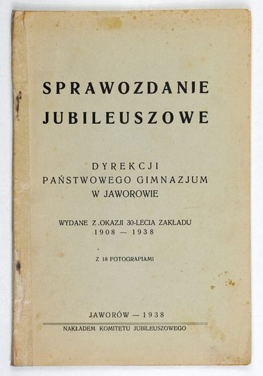 [JAWORÓW, Państwowe Gimnazjum]. Sprawozdanie jubileuszowe Dyrekcji ... wydane z okazji 30-lecia zakładu 1908-1938. Z 18 fotografiami. Jaworów 1938. Nakł. Komitetu Jubileuszowego. Druk. E. Szpilki. 8, s. 80. brosz.