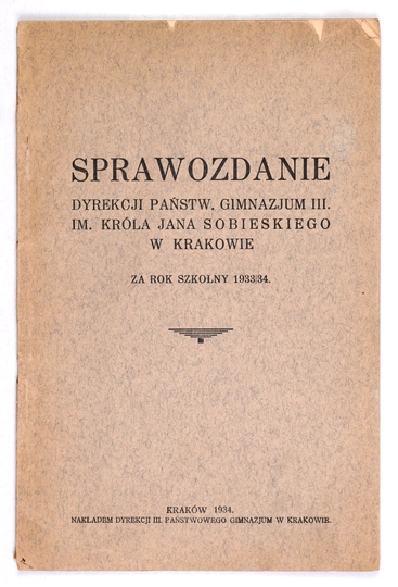 [KRAKÓW, Państwowe Gimnazjum III. im. Króla Jana Sobieskiego]. Sprawozdanie Dyrekcji ... za rok szkolny 1933/34. Kraków 1934. Nakł. Dyrekcji. 8, s. 62. brosz.