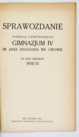 [LWÓW, Państwowe Gimnazjum IV im. Jana Długosza]. Sprawozdanie Dyrekcji ... za rok szkolny 1930/31. . Lwów 1931. Nakł. Gimnazjum [...]. 8, s. 23. brosz.