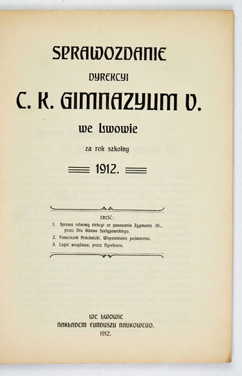 [LWÓW, C. k. Gimnazjum V]. Sprawozdanie Dyrekcyi ... za rok szkolny 1912. Lwów 1912. Nakł. Funduszu Naukowego. 8, s. 44, 44. brosz.