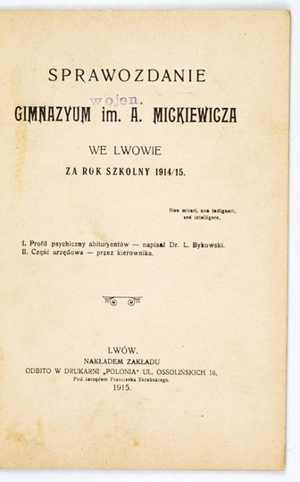 [LWÓW, Gimnazjum im. A. Mickiewicza]. Sprawozdanie wojen. ... za rok szkolny 1914/15. Lwów 1915. Nakł. zakładu. 8, s. 38. brosz.