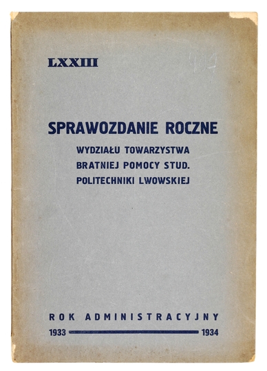 [LWÓW, Politechnika Lwowska]. LXXIII Sprawozdanie roczne Wydziału Towarzystwa Bratniej Pomocy Studentów ... za rok administracyjny 1933/34. Lwów [1934]. Nakł. Twa Bratniej Pomocy [...]. 8, s. 114, [6]. brosz.