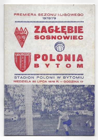 PREMIERA sezonu I-ligowego 1978/79. Zagłębie Sosnowiec - Polonia Bytom. Stadion Polonii w Bytomiu, 30 lipca 1978 r. [Sosnowiec?]. 1978. 8, s. 16. brosz.