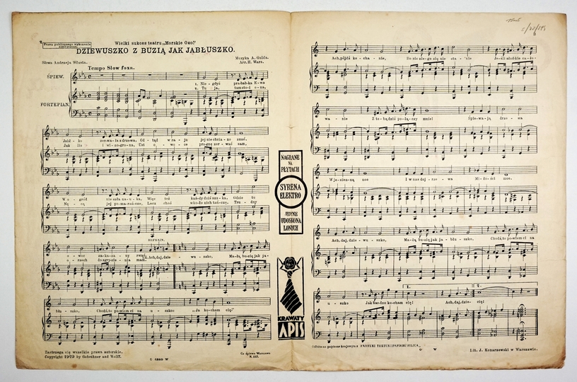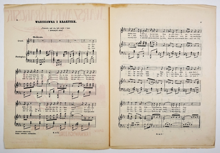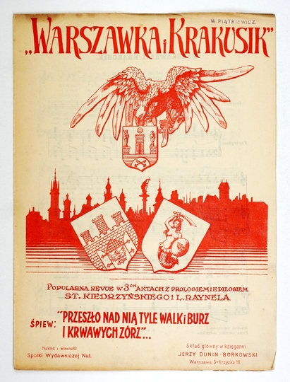 [NUTY]. "WARSZAWKA i Krakusik". Śpiew: "Przeszło nad nią tyle walk i burz i krwawych zórz"... Popularna revue w 3-ch aktach z prologiem i epilogiem St. Kiedrzyńskiego i L. Raynela. Warszawa [ca 1920]. Spółka Wydawnicza Nut. 4, s. 4.