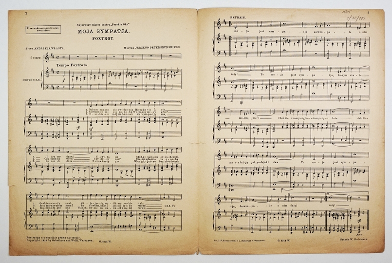 [NUTY]. MOJA sympatja! Nowa popularna melodja z teatru "Perskie Oko". Warszawa 1928. Gebethner i Wolff. 4, s. 3, [1].