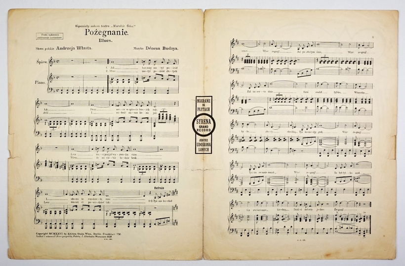 [NUTY]. POŻEGNANIE. (Żegnaj...). Czarujący blues z teatru "Morskie Oko". Warszawa 1928. J. Altschuler. 4, s. [3], 1.