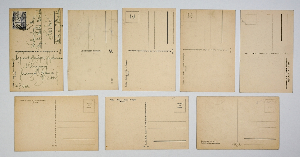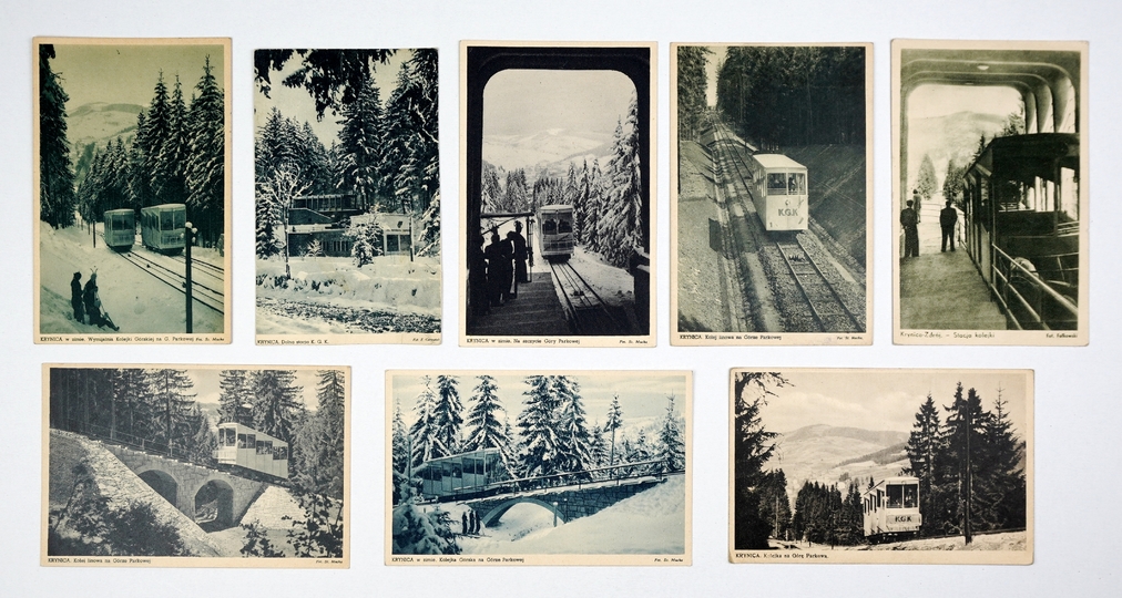 [KRYNICA - kolejka z Górę Parkową]. Zestaw 8 pocztówek przedstawiających wagonik kolejki i stacje.