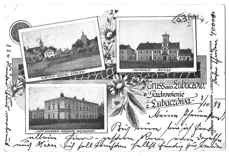 [LUBACZÓW]. Gruss aus Lubaczów. Pozdrowienie z Lubaczówa. Kosciol - cerkiew, Ratusz, Koszary wojskowe.