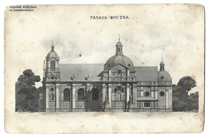 [LUSZOWICE]. Budowa kościoła w Luszowicach. Fasada boczna.