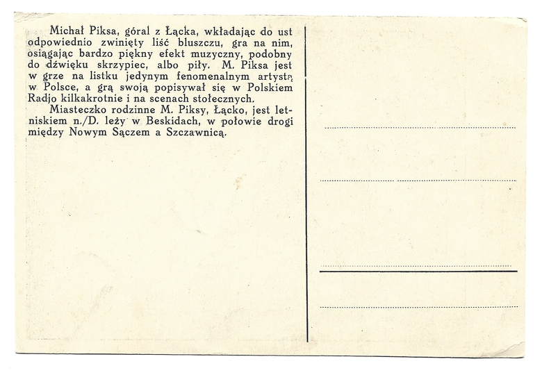 [ŁĄCKO]. Michał Piksa, góral z Łącka, wirtuoz w grze na listku i harmonji.