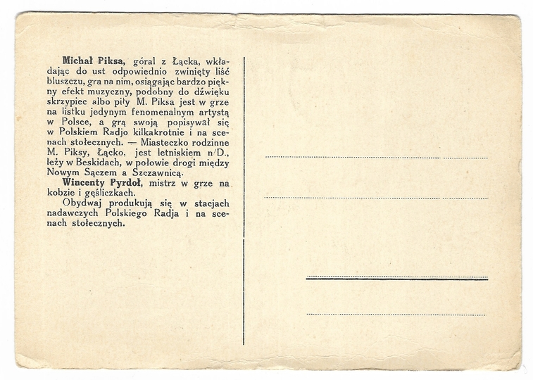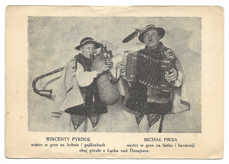 [ŁĄCKO]. Wincenty Pyrdoł mistrz w grze na kobzie [...], Michał Piksa mistrz w grze na listku [...] obaj górale z Łącka nad Dunajcem.