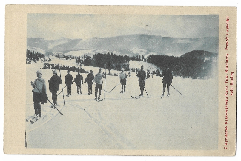 [SUCHA BESKIDZKA]. Z wycieczek Krakowskiego Karp. Tow. Narciarzy. Powrót z wyścigu koło Suchej.