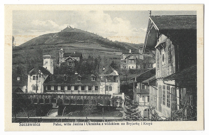 [SZCZAWNICA]. Szczawnica. Pałac, wille Janina i Ukrainka z widokiem na Bryjarkę i Krzyż.