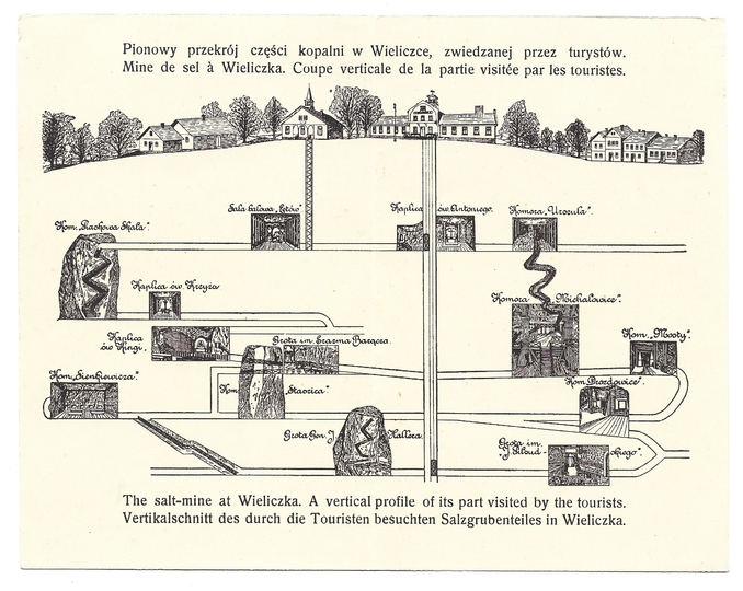 [WIELICZKA]. Pionowy przekrój części kopalni w Wieliczce, zwiedzanej przez turystów.
