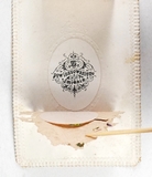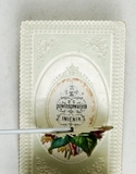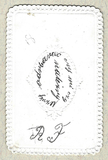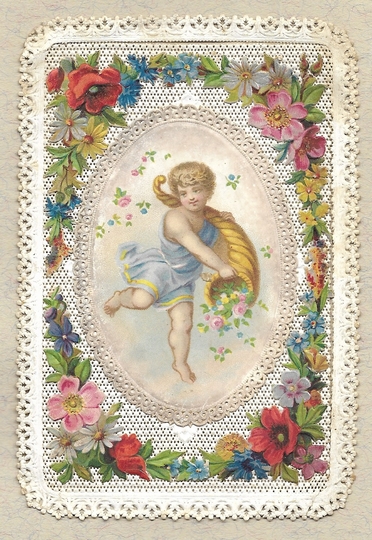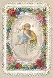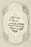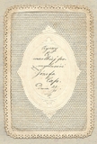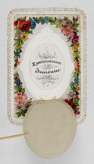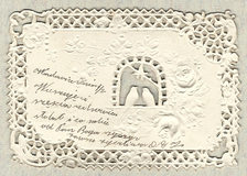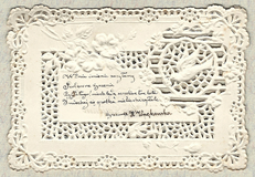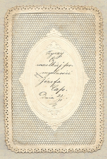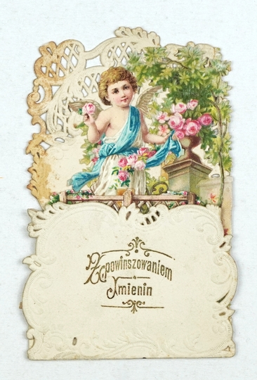 Ażurowy bilecik życzeniowy form. 11,7x7,8 cm. W centrum owal z puttem, za nim ukryte pole z życzeniami. Na odwrocie odręczne życzenia: "Życzy Ci wszelkiej pomyślności Józefa Cap. Dnia 21/11". Niewielkie zaplamienia, niewielkie załamania narożników.