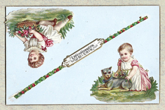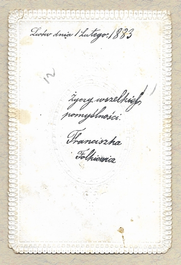 Bilecik życzeniowy form. 10,8x7,2 cm. Dziewczynka wśród kwiatów przesłaniająca nadruk z życzeniami. Na odwrocie odręczne życzenia: "Życzy wszelkiej pomyślności Franciszka Folkiewicz", dat. 1 II 1883 we Lwowie. Niewielkie zaplamienia, takież ubytki narożników.