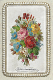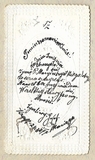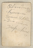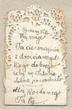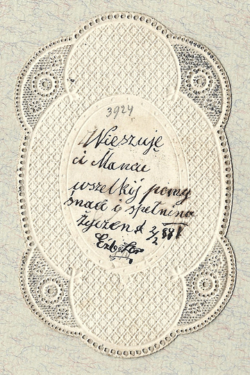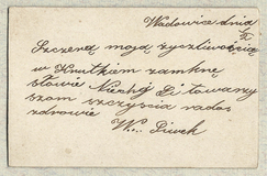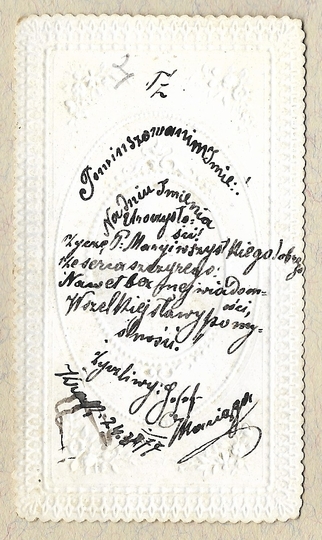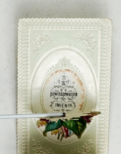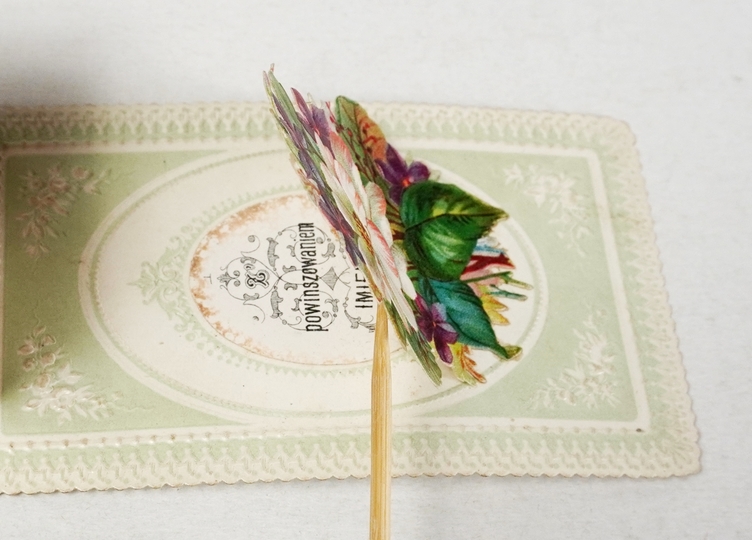 Bilecik życzeniowy form. 8,7x4,9 cm. Bukiet przesłaniający ukryty za nim napis z życzeniami. Na odwrocie odręczne życzenia: Z Powinszowanim Imie:! Na dniu Umienia Uroczystości! Życzę P. Maryi wszystkiego dobrego ze serca szczyrego. Nawet bez mej wiadomości, Wszelkiej sławy pomyślności!", dat. 24 III 1877 w Krakowie. Stan dobry.