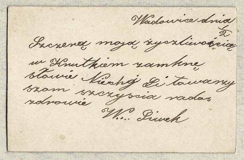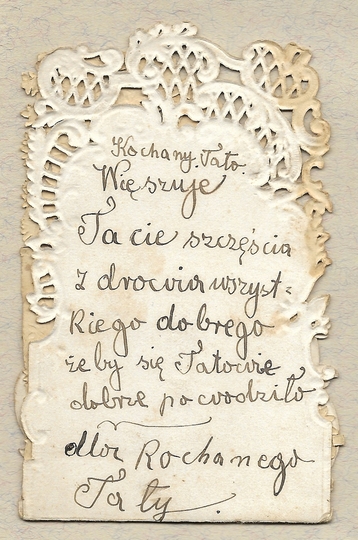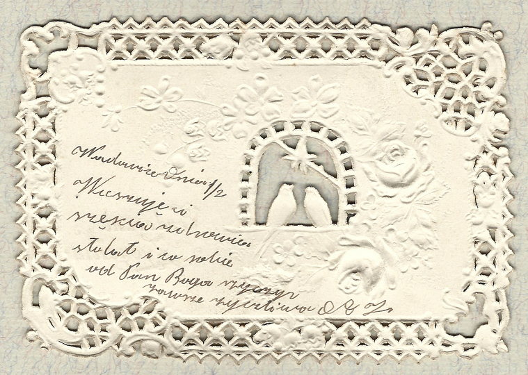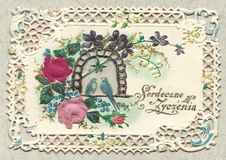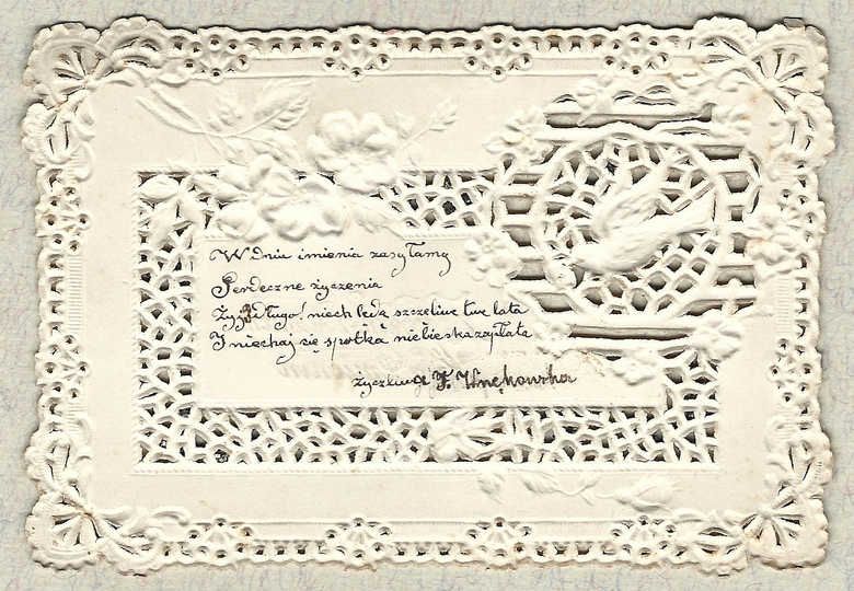 Bilecik tłoczony, po części ażurowy, form. 8,1x11,7 cm, delikatnie zdobiony brokatem. Na odwrocie odręczny tekst: "Wieszuję ci szęscia zdrowia sto lat i co sobie od Pan Boga rzyczyz", dat. w Wadowicach dn. 1/2. Podpis "zawsze życzliwej" - nieczytelny. Stan dobry.