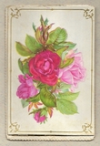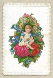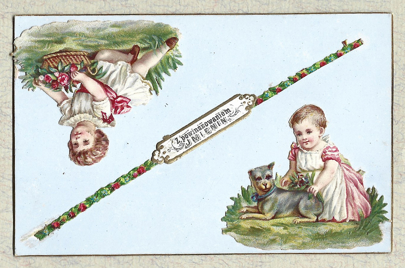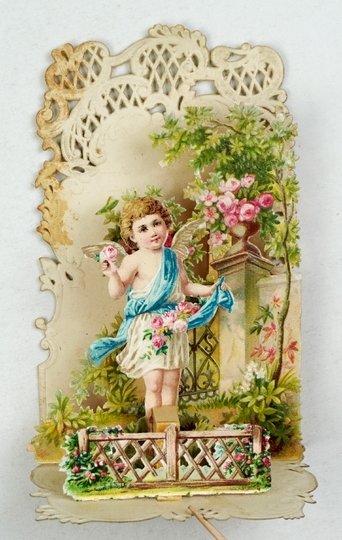 Ażurowy, tłoczony karnet kulisowy form. 11,7x7,5 cm. Wewnątrz stojące putto z kwiatami na tle różanego ogrodu. Na odwrocie odręczne życzenia pisane dziecięcą ręką: "Kochany Tato. Więszuję Tacie szczęścia zdrowia wszystkiego dobrego żeby się Tatowi dobrze powodziło. dla kochanego Taty". Zabrązowienia narożnika, poza tym stan dobry.