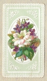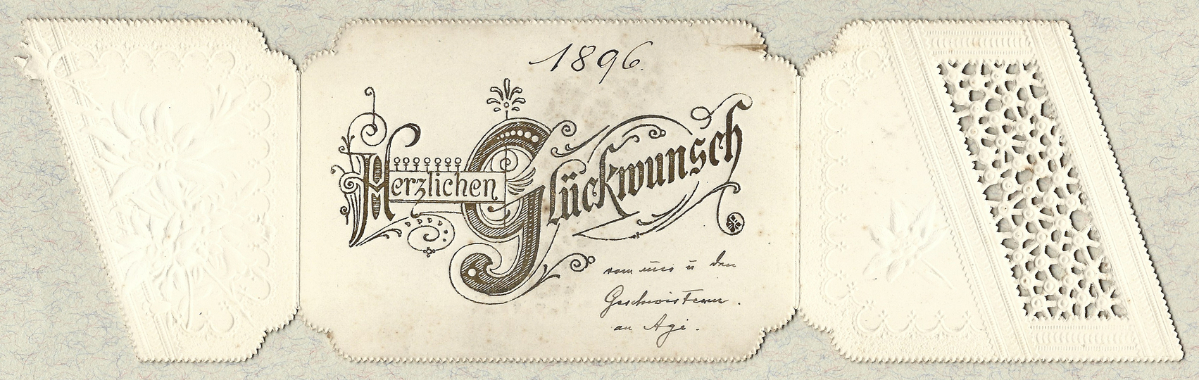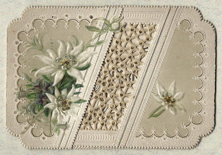 Tłoczony i częściowo ażurowy karnecik życzeniowy form. 8x11,6 cm (złożony). Trzy szarotki. Wewnątrz krótkie odręczne życzenia po niemiecku i data 1896. Stan dobry.
