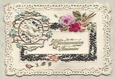 Bilecik ażurowy, tłoczony form. 7,7x11,5 cm, zdobiony brokatem. Gołąbek w locie i kwiaty. Na odwrocie odręczne życzenia: "Żyj długo! niech będą szczęliwe twe lata i niechaj cię spotka niebieska zapłata" od życzliwej Wnękowskiej. Stan dobry.