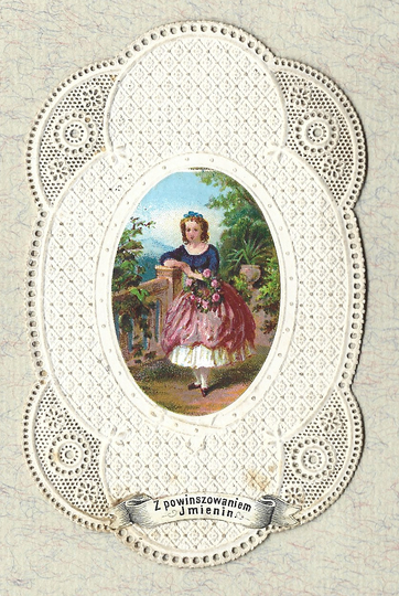Bilecik ażurowy form. 9,8x6,2 cm. Dziewczyna z różanym wiankiem w ogrodzie. Na odwrocie odręczne życzenia: "Wieszuję ci Mancu [?] wszelkij pomyśnaci i spełnienia życzen. d. 2/2 881. Eżbieta". Stan bardzo dobry.