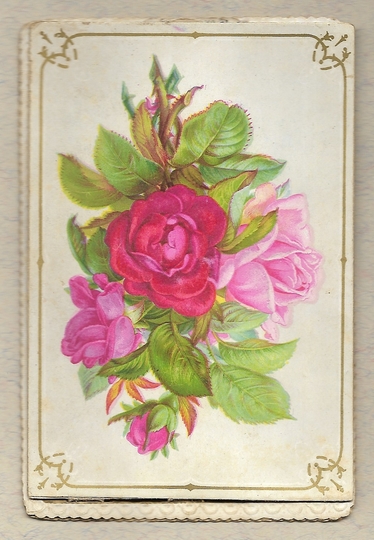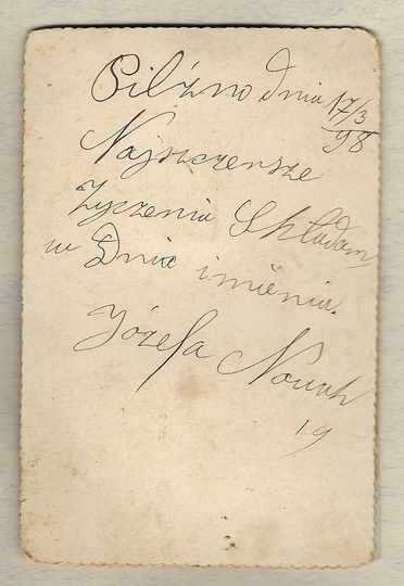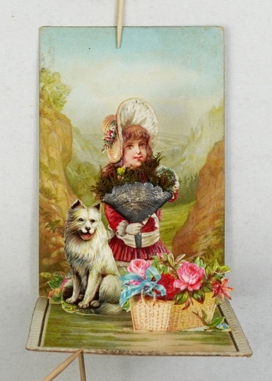 Karnet kulisowy form. 11,5x7,5 cm. Na przedniej stronie bukiet róż, wewnątrz kulisowa scena z dziewczyną z kwiatami, psem, koszem z kwiatami i pejzażem górskim w tle. Na odwrocie odręczne życzenia imieninowe skreślone niewprawną ręką przez Józefę Nowak w Pilźnie dn 17 III 1898.